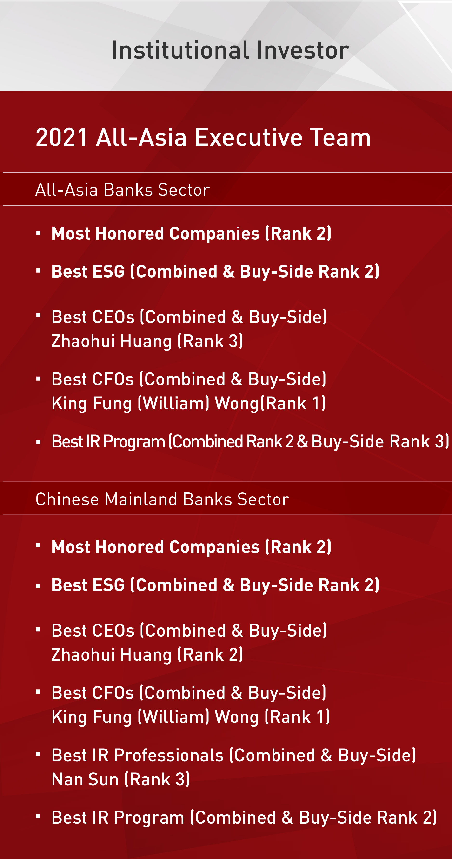 In the awards organized by Institutional Investor over the years before, CICC had accomplished remarkable achievements, by winning Most Honored Companies in 2017 and 2019 and Best ESG in 2019 and 2020, as well as capturing Best CEO, Best IR Program, and Best Corporate Governance for several times.