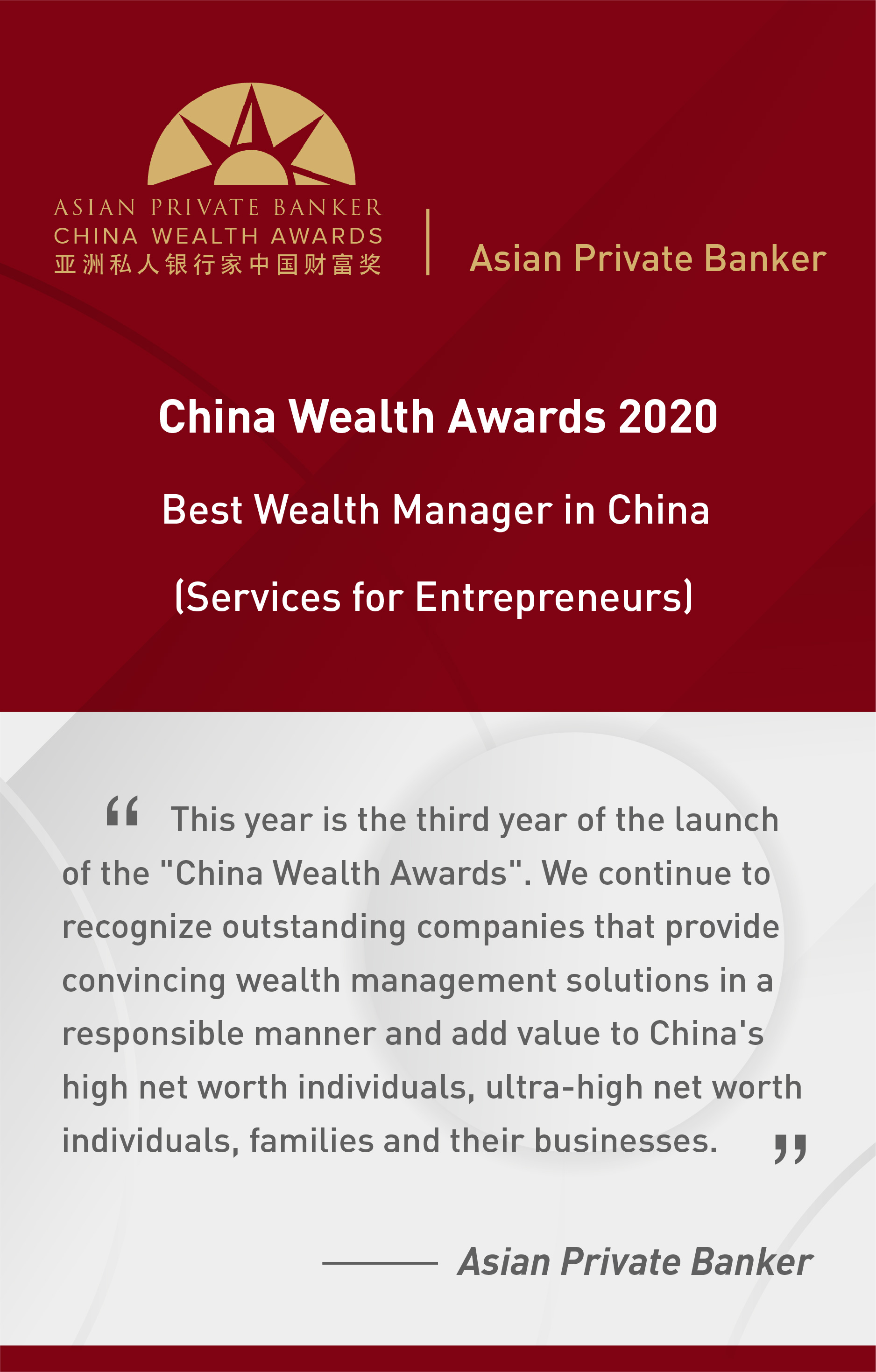 Asian Private Banker released the full results of its China Wealth Awards 2020 recently, in which CICC achieved great result again. By leveraging on its professional knowledge and quality customer services, CICC won the heavy-weight title, Best Wealth Manager in China (Services for Entrepreneurs), for 3 consecutive years. This is a tremendous achievement among so many competitors in the market.