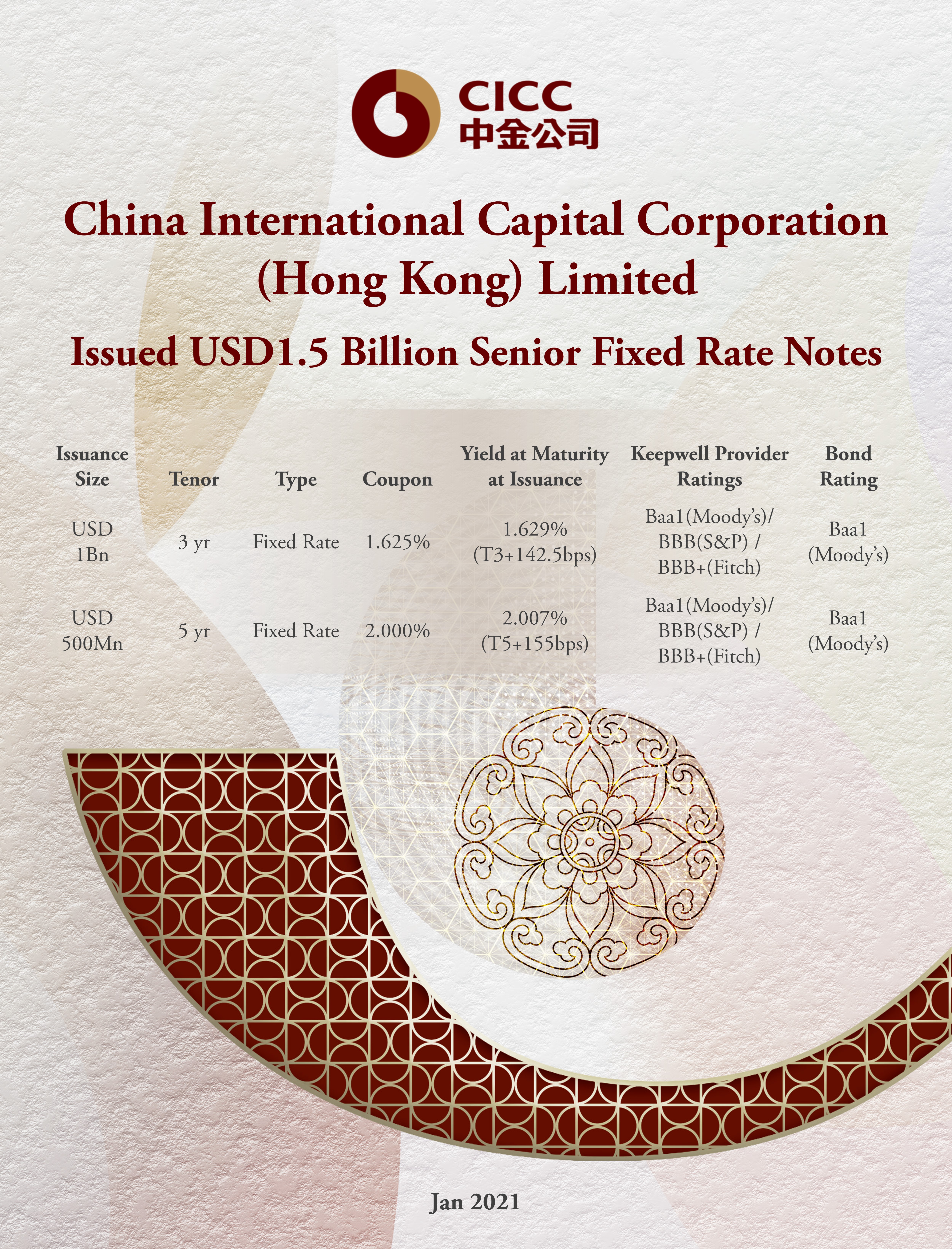 On January 19, 2021, CICC successfully issued USD1bn 3-year and USD500mm 5-year fixed-rate senior notes with a total issuance size of USD1.5bn, making it the largest-ever overseas bond offering by a Chinese investment bank. The 3-year tranche and 5-year tranche were issued at the yield to maturity of 1.629% (T3+142.5bps) and 2.007% (T5+155bps), with coupon rate of 1.625% and 2.000%, respectively. The notes constitute drawdown of CICC’s existing USD10bn GMTN programme.