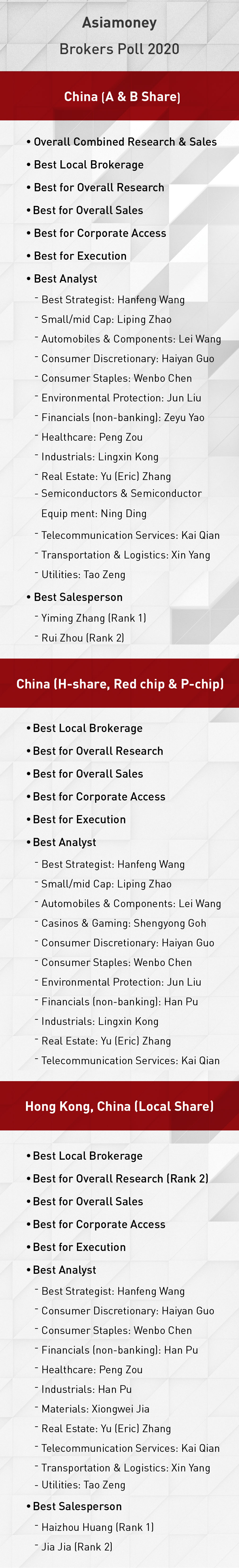 CICC has won Best Local Brokerage for 17 straight years (2004-2020) and captured Best for Overall Research and Best for Overall Sales for 15 straight years (2006-2020) in Asiamoney Brokers Polls.