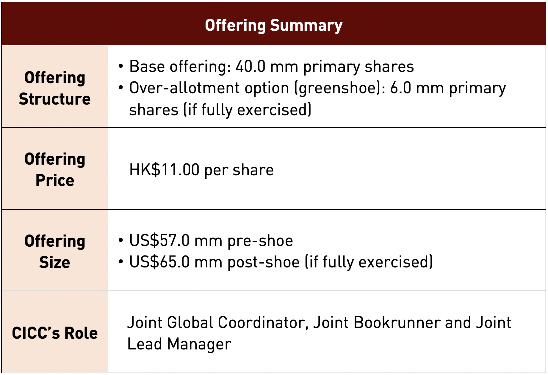 CICC actively assisted the Company in an unstable market environment. The book was multiple times covered by CICC’s large volume of high quality orders including top long-only investors and hedge funds, leading to significant oversubscription in HKPO and international offering.