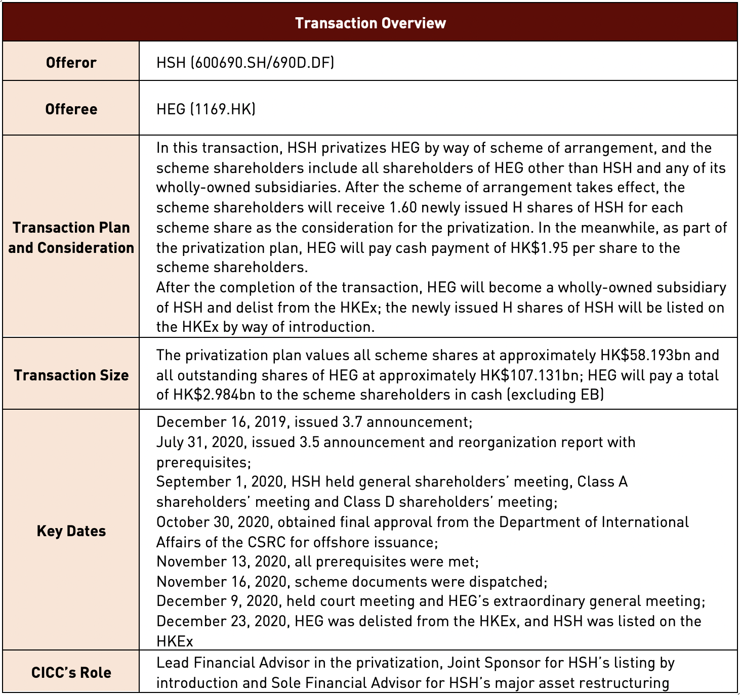 Taking overall coordination of all work streams at home and abroad, including the design of the transaction plan and fund flow path, communication with shareholders, and the coordination of the transaction process and information disclosure. CICC took overall coordination for all four parallel work streams at home and abroad, i.e., H-share privatization, A-share major asset restructuring, H-share listing by introduction and conversion of HSH’s EB to H-share CB, and made sure coordinated information disclosure of HSH and HEG.