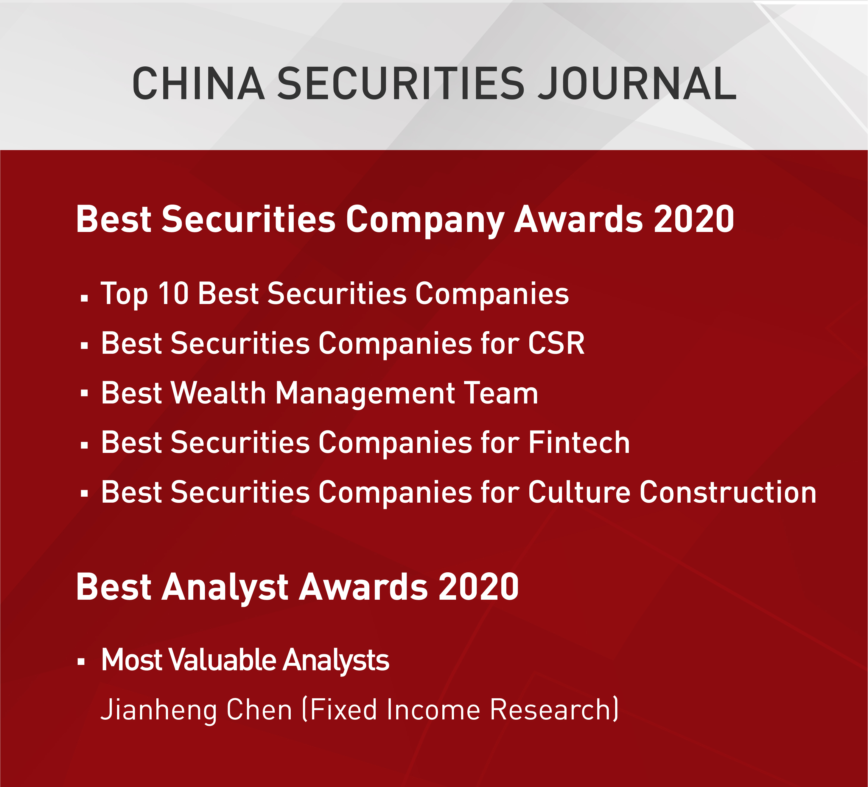 The series awards are carried out by China Securities Journal annually targeting the Securities Companies, listed companies, public offering funds, private funds and financial analysts. The Best Securities Company Awards, which adheres to the principles of openness and fairness, aims to select a number of benchmark securities companies and management teams with outstanding performance and management, active social responsibility and huge development potential, hoping to contribute to the long-term and healthy development of the capital market.