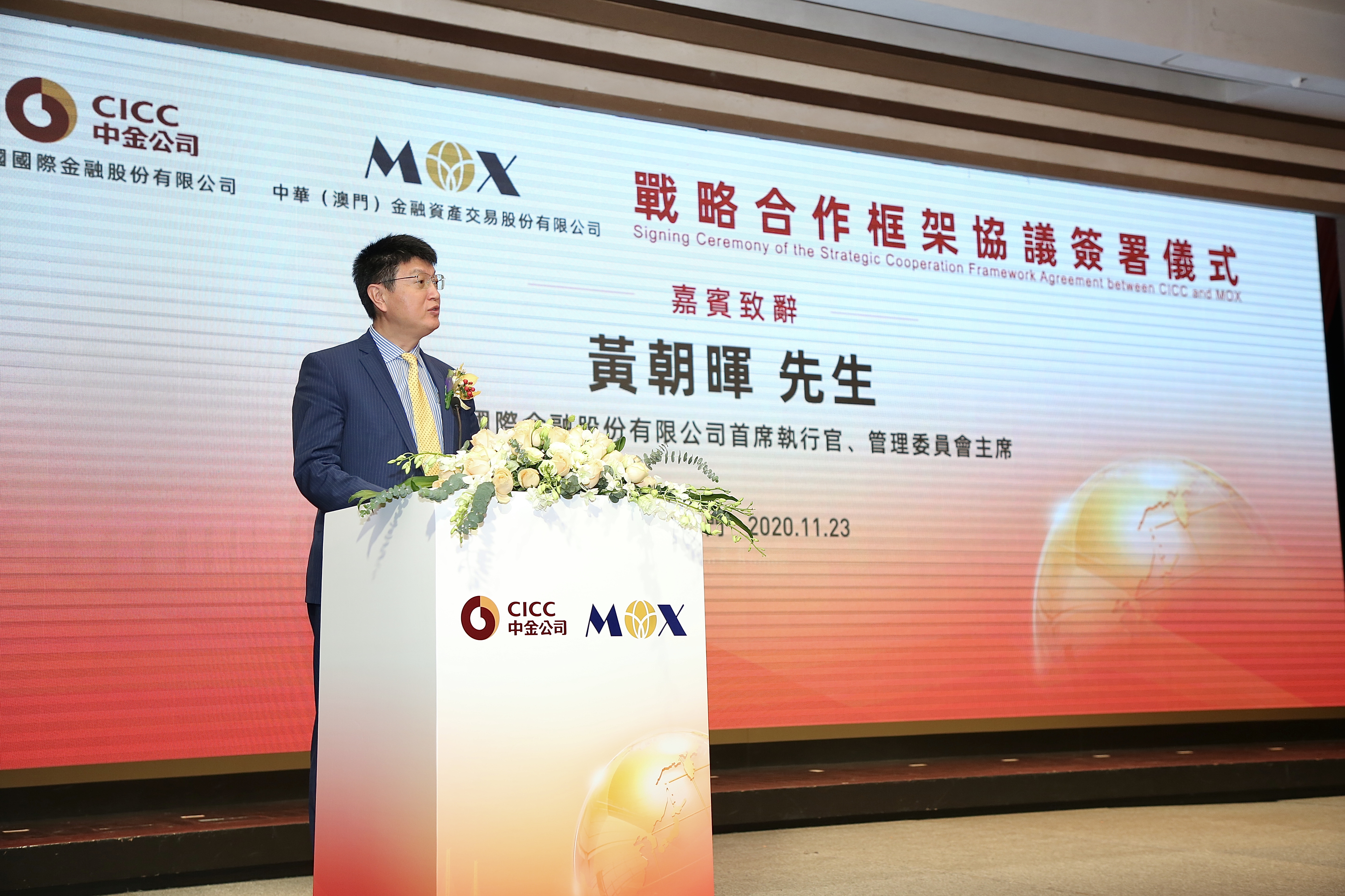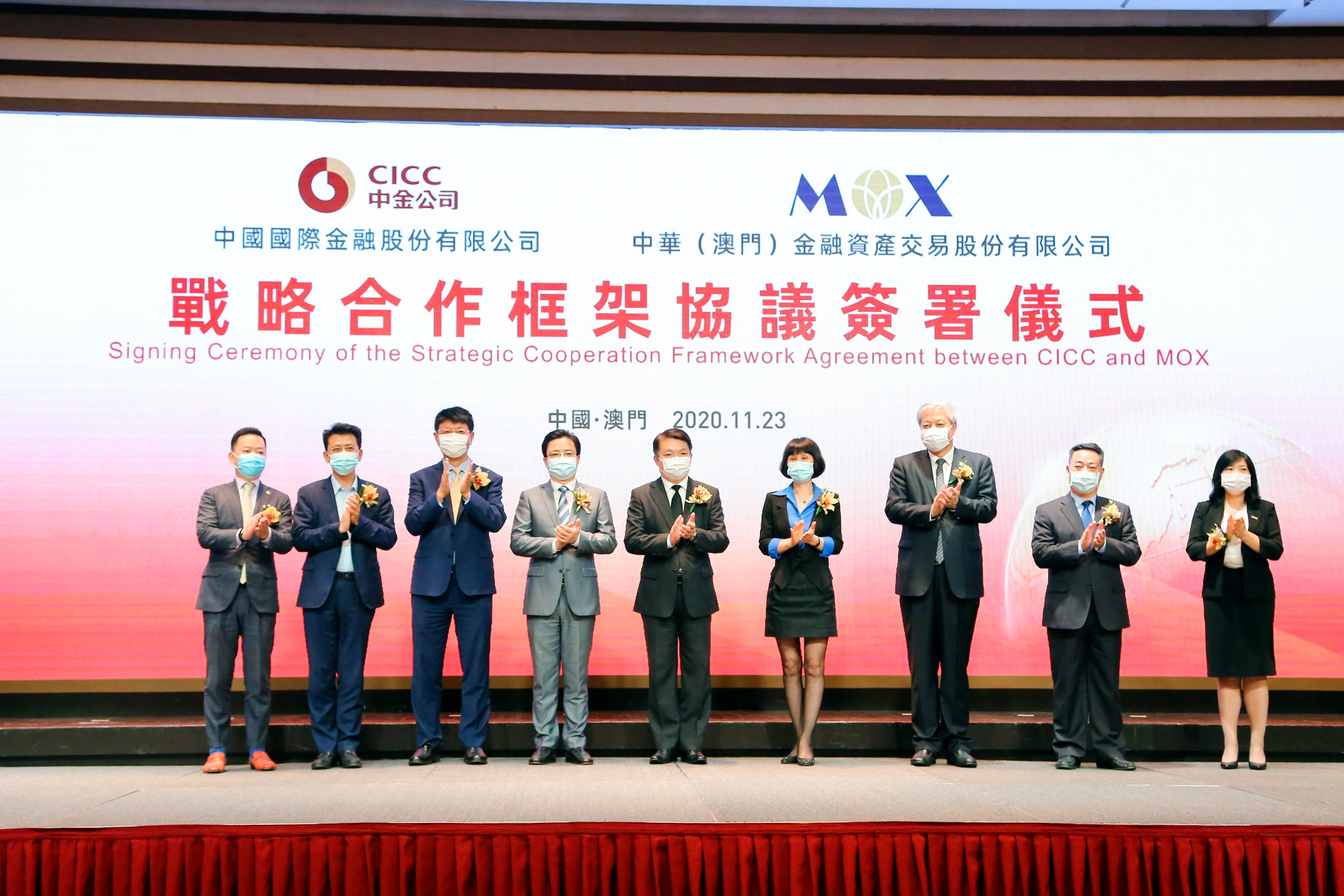 On November 23, CICC signed a strategic cooperation framework agreement with Chongwa (Macao) Financial Asset Exchange Co., Ltd. (“MOX”) in Macau. The signing ceremony was attended by Mr. Lei Wainong, Secretary for Economy and Finance of Macao S.A.R., Ms. Zhu Hong, Deputy Director General of Economic Affairs Department of the Liaison Office of the Central People’s Government in the Macao S.A.R., Mr. Ding Tian, Deputy Secretary-General of the Permanent Secretariat of the Forum for Economic and Trade Co-operation Between China and Portuguese-speaking Countries, Mr. Fu Jianguo, Chairman of Nam Kwong (Group) Co., Ltd. (“Nam Kwong”) and MOX, Mr. Huang Zhaohui, CEO of CICC, and representatives of business and financial leaders in Macao.