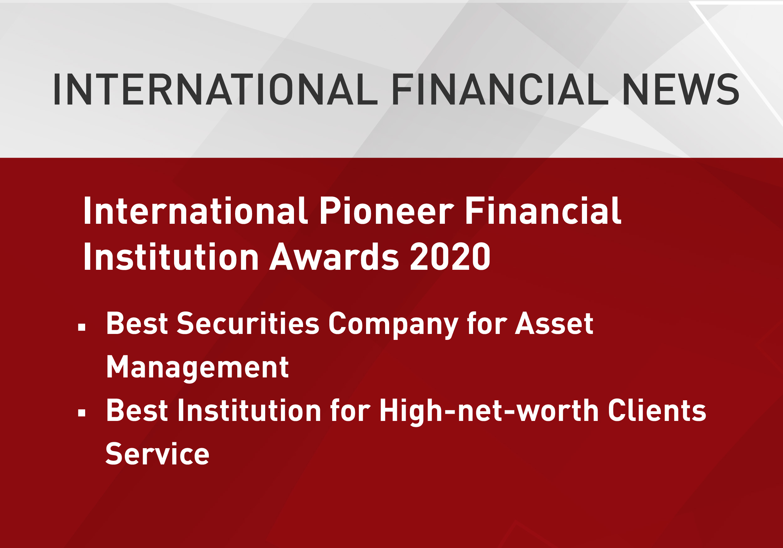 International Financial News released the full list of its International Pioneer Financial Institution Awards 2020 in Shanghai recently. By leveraging on its professional capability and quality customer services, CICC achieved a great result, winning two heavy-weight institutional titles of Best Securities Company for Asset Management and Best Institution for High-net-worth Clients Service.