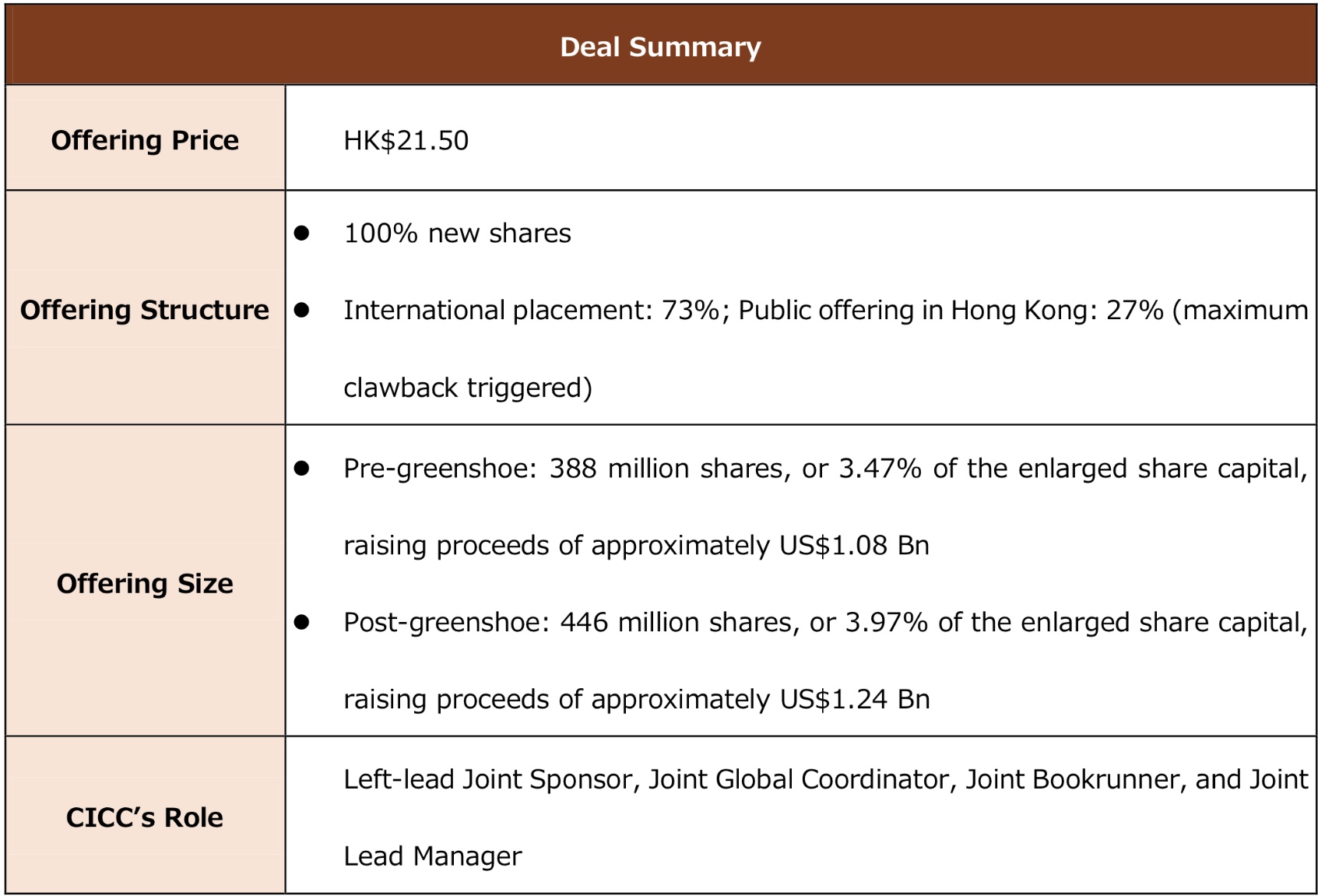 CICC acted as the left-lead Joint Sponsor and Joint Global Coordinator on this deal, and led the overall project execution and marketing workstream, assisting the Company in listing on the Main Board of HKEx.