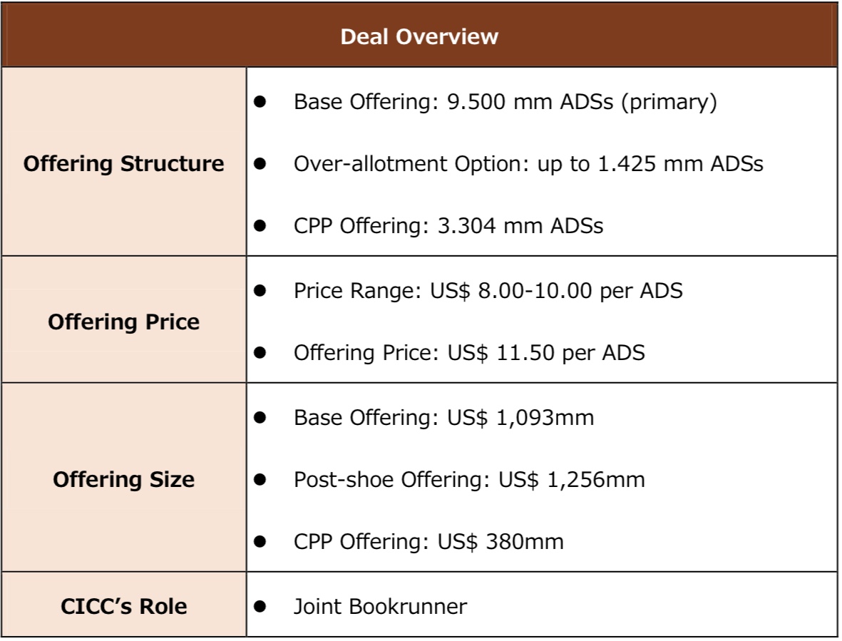 Acting as the joint bookrunner, CICC assisted the Company to grasp the excellent window in the US stock market to initiate the public offering, and won high recognition from the Company’s management for its professional advice, full commitment and efficient execution.
