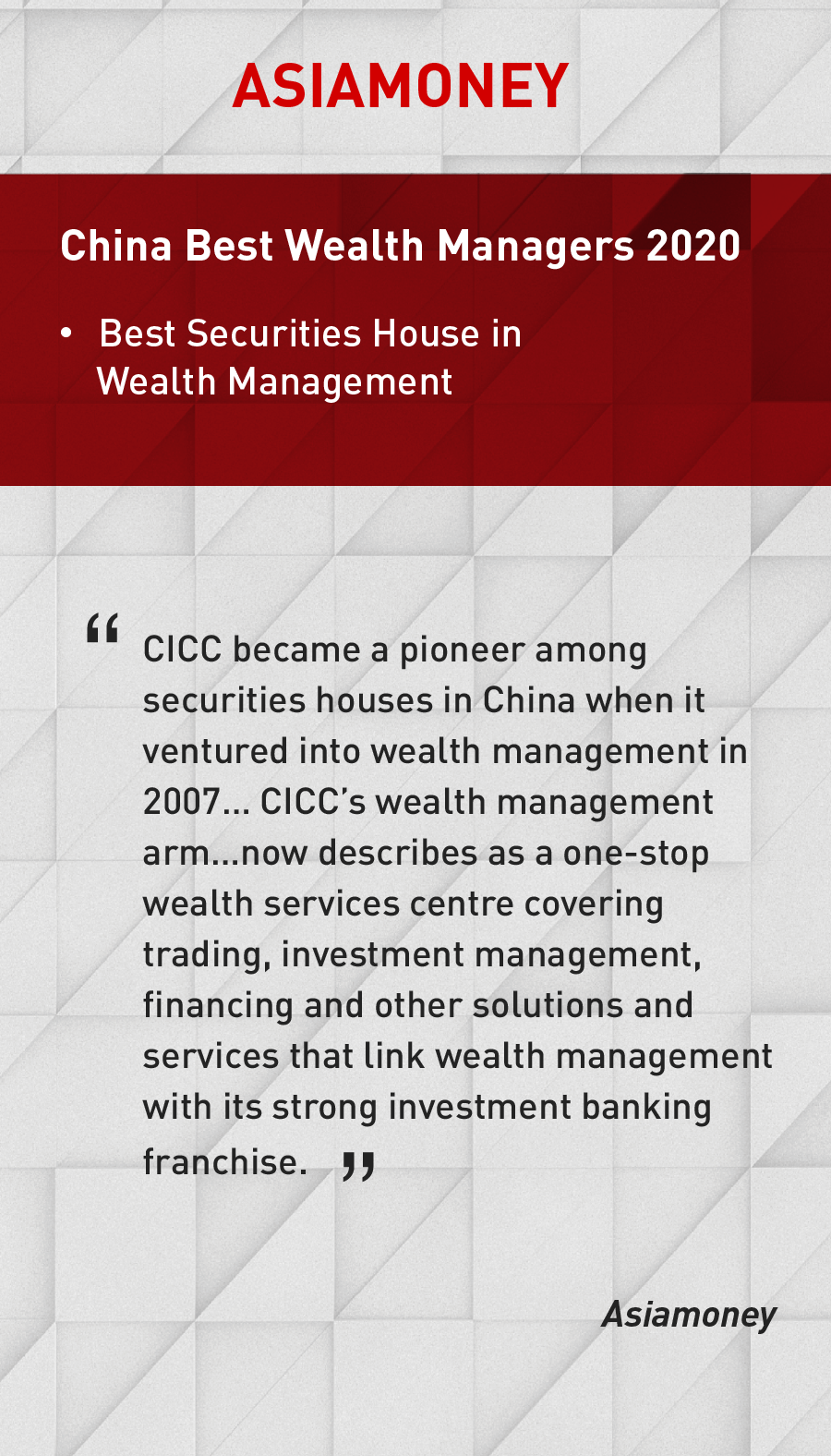 CICC Wins Best Securities House in Wealth Management Again in Asiamoney Award 2020