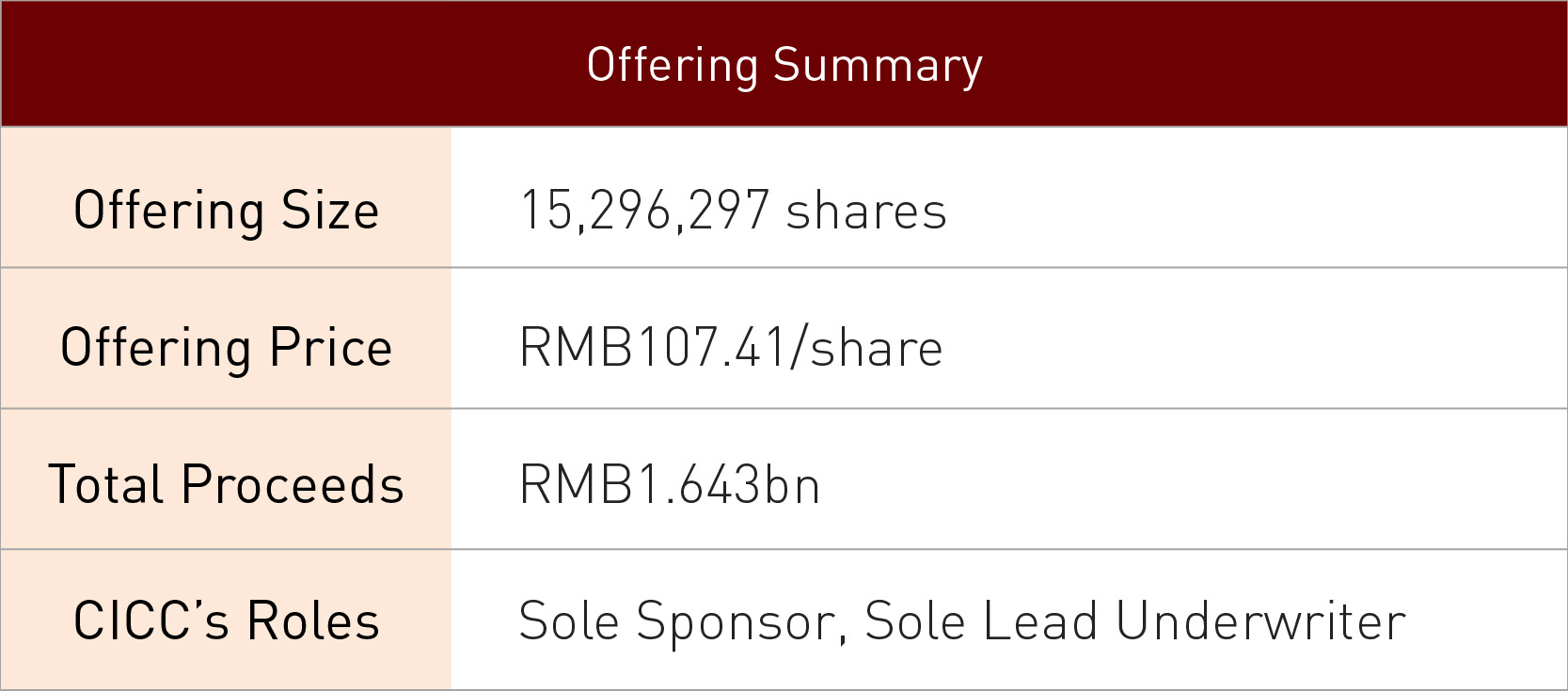 CICC as Sole Sponsor and Lead Underwriter took full charge of all work streams and closely controlled the progress of the deal execution, and is highly recognized by the Company for our efficient execution and team collaboration. During the process of regulatory review and approval, CICC provided high quality and comprehensive investment banking services, assisted the Company with regulatory communications, accurately identities the regulatory concerns and resolved multiple difficulties for the Company. At stage of offering, CICC deeply tapped into the Issuer’s investment highlights and equity story, coordinated all parties to minimize adverse impact on marketing due to the 2019-nCoV outbreak and successfully completed pricing and offering against the backdrop of severe market volatility.