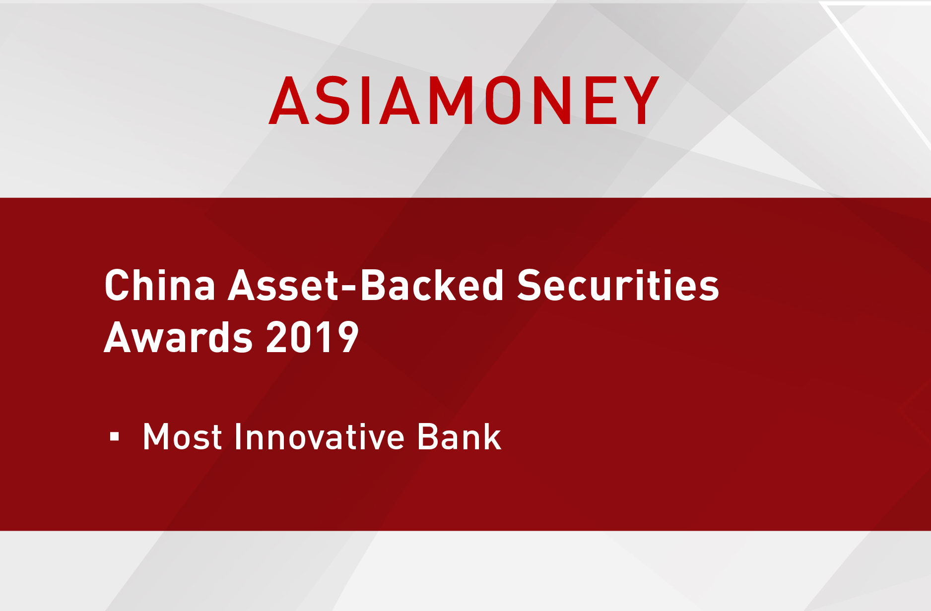Asiamoney released the full list of its “China Asset-Backed Securities Awards 2019” recently. By leveraging on its outstanding professional capability and project performance, CICC achieved great result of winning the heavy-weight title of Most Innovative Bank for two consecutive years. This was a really tremendous achievement for CICC among so many competitors in the market.