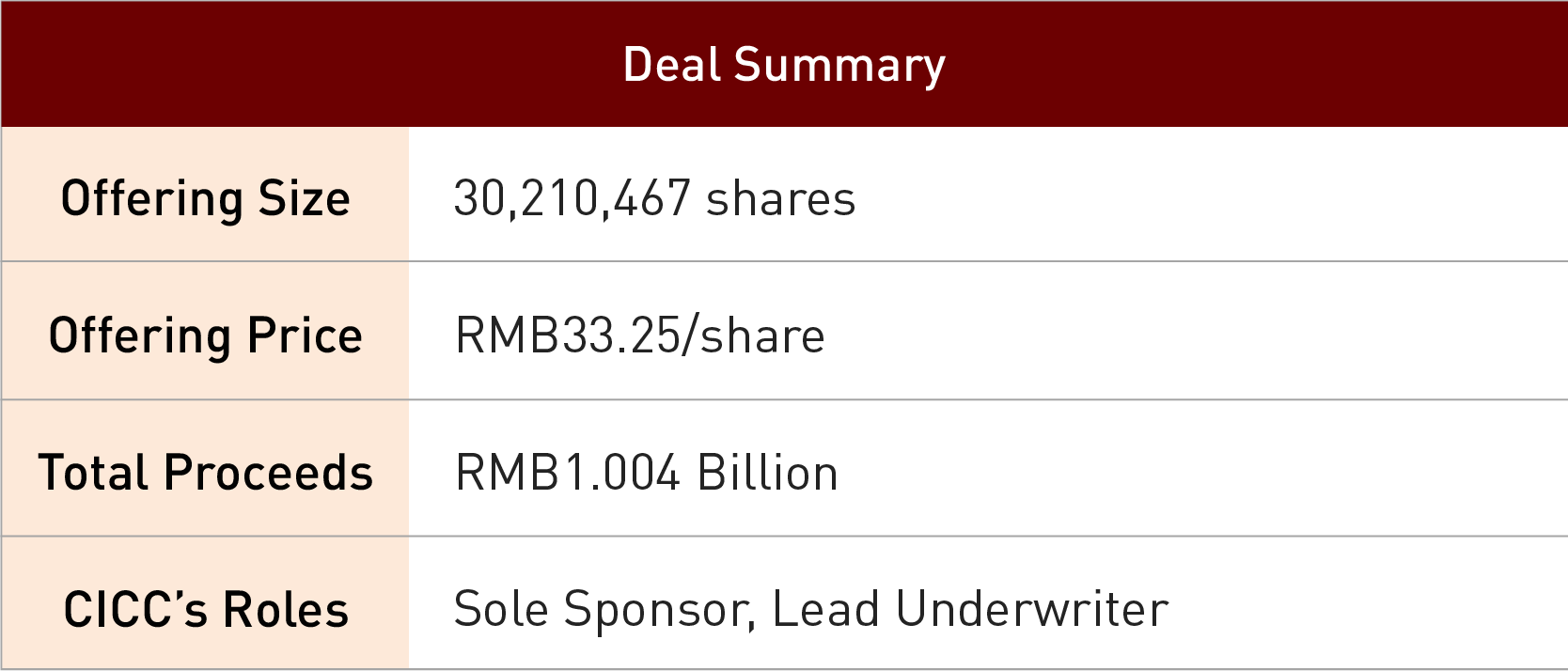 As Sole Sponsor and Lead Underwriter, CICC strictly controlled the progress of deal execution, received high recognition from the Company by providing professional and efficient deal execution and team collaboration. The IPO passed the Listing Committee review smoothly with no issues to be implemented thereafter. CICC provided high-quality and comprehensive investment banking services and assisted the Company in regulatory communications to conduct in-depth due diligence, make thorough analysis and demonstrate from multiple perspectives, addressing key regulatory concerns and facilitating the deal to proceed smoothly. At the stock issuance stage, CICC deeply tapped into the investment highlights, laying a solid foundation for the final pricing and successful issuance through multiple rounds of marketing.