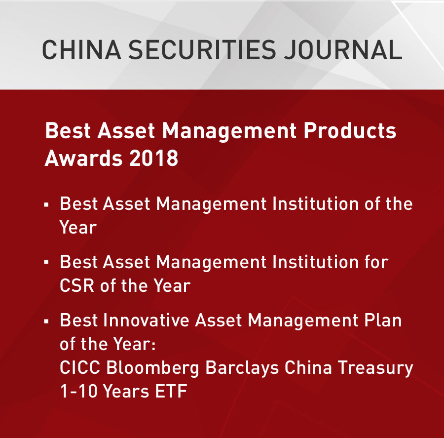 China Securities Journal released the full list of its Best Asset Management Products Awards recently. By leveraging on its professional capability, quality customer services and outstanding product performance, CICC achieved a great result, winning two heavy-weight corporate titles of Best Asset Management Institution of the Year and Best Asset Management Institution for CSR of the Year. Meanwhile, CICC Bloomberg Barclays China Treasury 1-10 Years ETF won the product prize of Best Innovative Asset Management Plan of the Year. This is a tremendous achievement among so many competitors in the market.