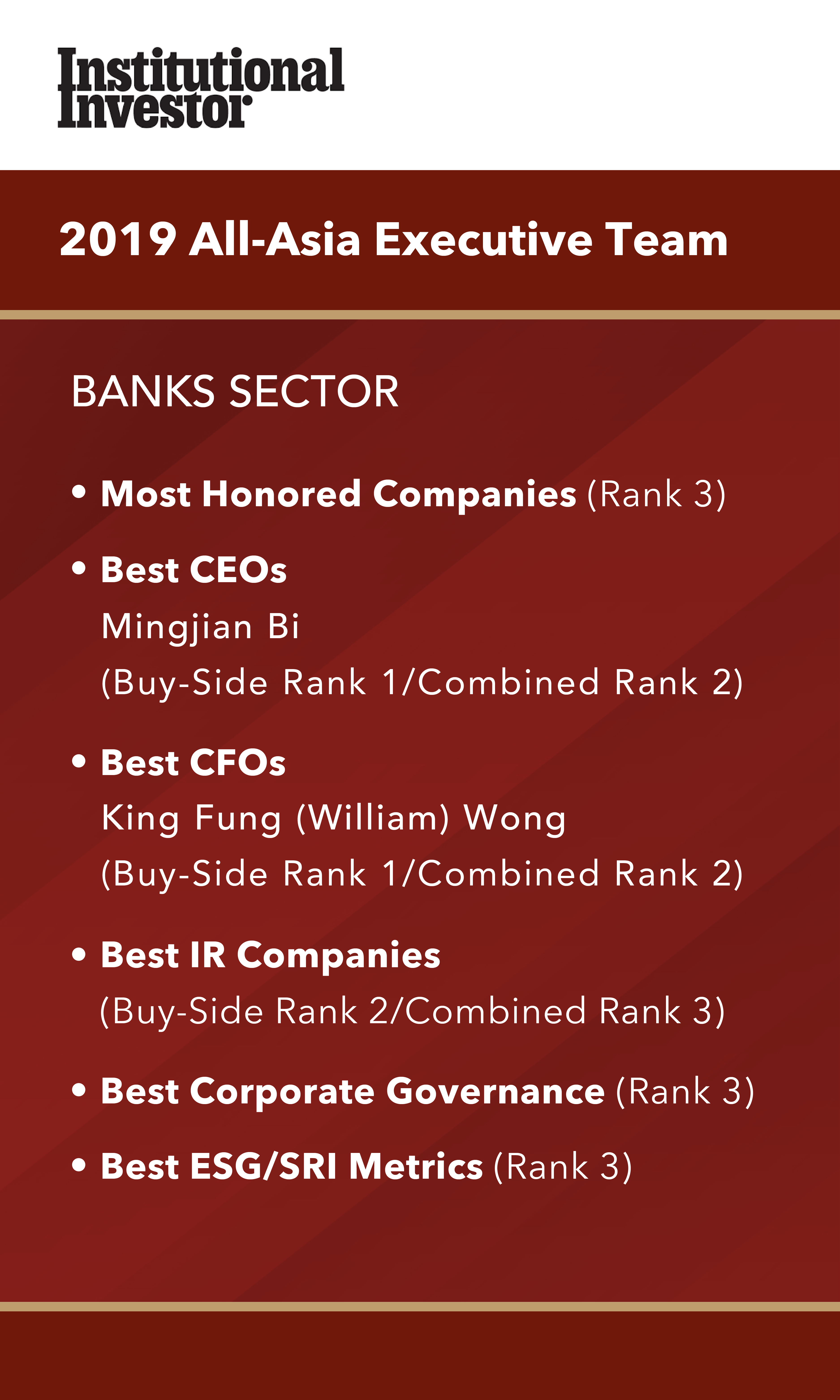 Entering its fifth decade, Institutional Investor offers a host of proprietary research and rankings that serve as respected industry benchmarks. The 2019 All-Asia Executive Team ranking reflects the views of nearly 2,500 investment professionals from 892 financial services firms.