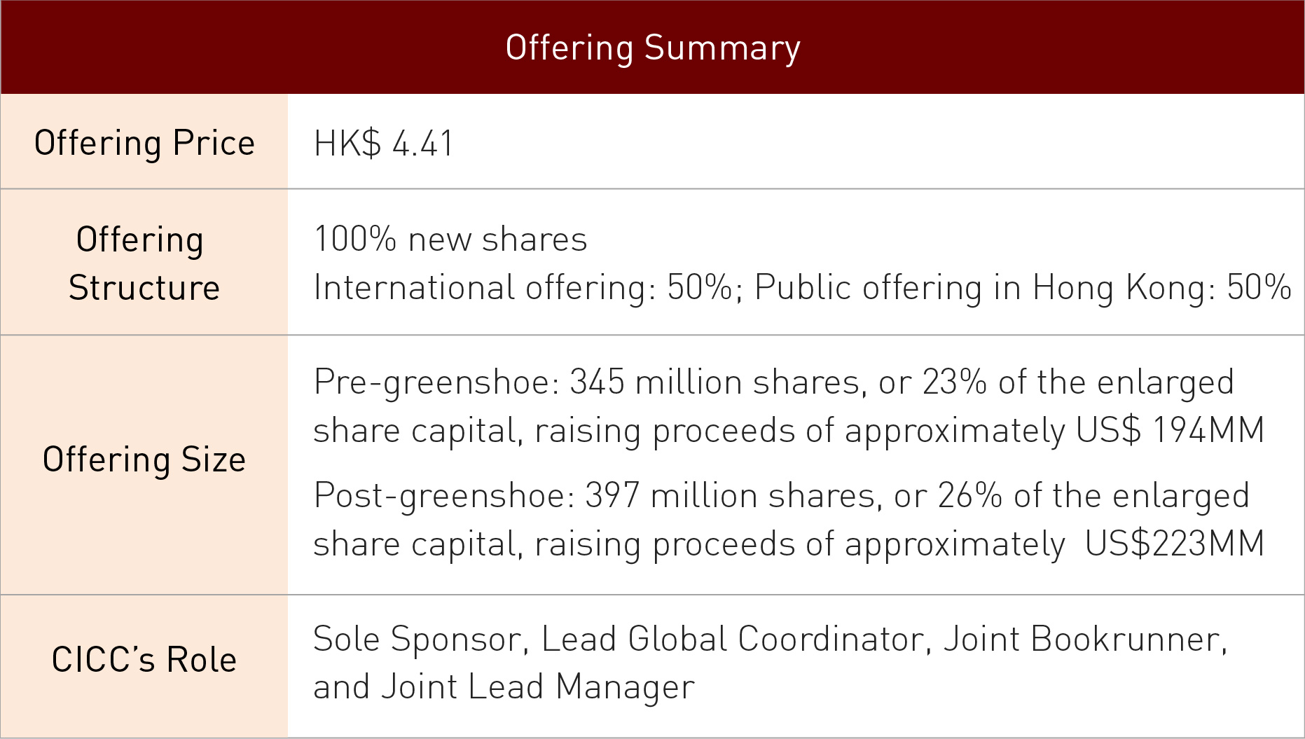 As a leading investment bank with “China Roots, International Reach”, CICC will continue to utilize its capital market expertise as well as its seamless cooperation of onshore and offshore businesses to provide continuous support to our customers in terms of introduction of global investors, reaching international capital market, and promoting global business development.