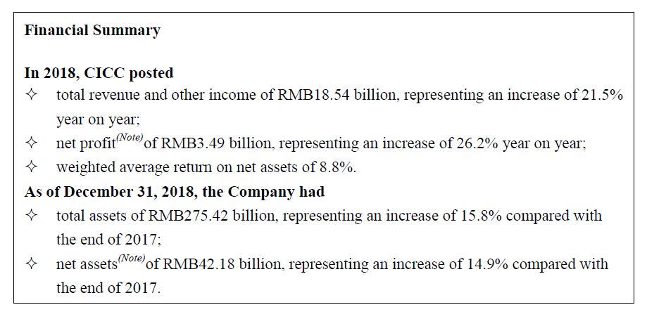 China International Capital Corporation Limited (“CICC” or “the Company”, Stock code: 3908.HK) announced its annual results for the twelve months ended December 31, 2018. In 2018, the Company recorded total revenue and other income of RMB18.54 billion; and profit (Note) of RMB3.49 billion; with a weighted average return on net assets of 8.8%. As at the end of 2018, the total assets of the Company amounted to RMB275.42 billion, representing an increase of 15.8% compared with the end of 2017; net assets (Note) amounted to RMB42.18 billion, representing an increase of 14.9% compared to the end of 2017.