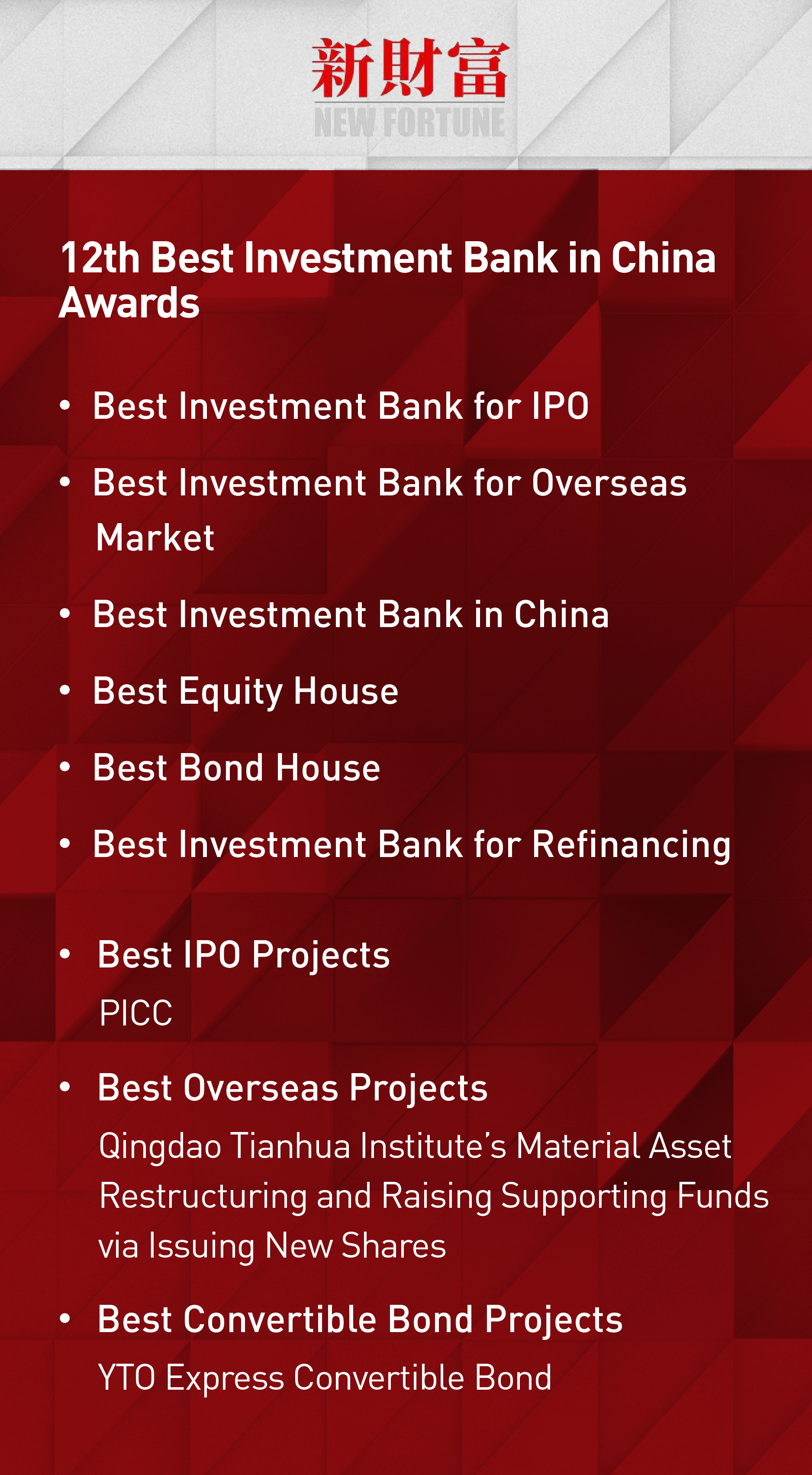 New Fortune released the full list of its 12th Best Investment Bank in China Awards recently, in which CICC achieved great results once again by winning many heavy-weight titles, such as topping Best Investment Bank for IPO and Best Investment Bank for Overseas Market.