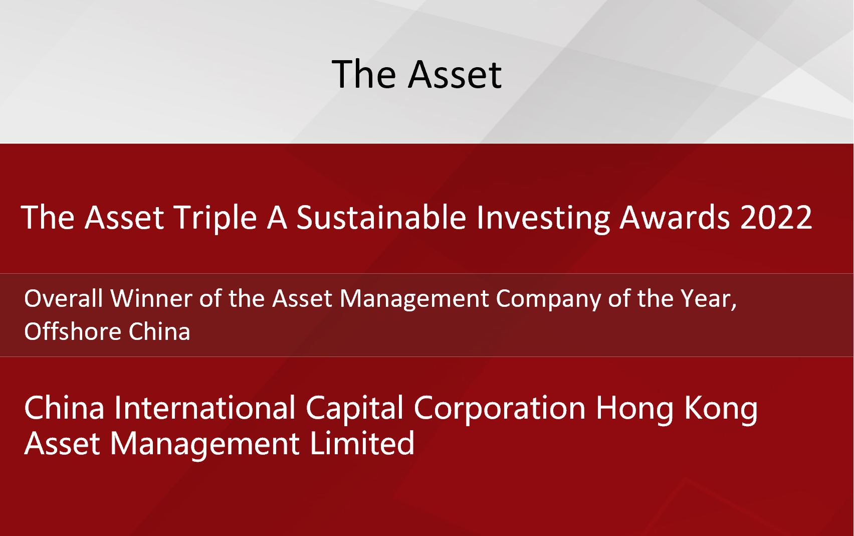 The Asset announced on 25 July 2022 the winners of The Asset Triple A Sustainable Investing Awards 2022 in asset management. China International Capital Corporation Hong Kong Asset Management Limited (CICC HKAM), a wholly owned subsidiary of China International Capital Corporation Limited (“CICC”), was honored as the Overall Winner of the Asset Management Company of the Year, Offshore China (the “Award”) for the second time in a row after first claiming it in 2021.