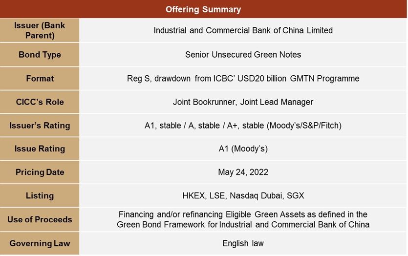 On May 24, 2022, Industrial and Commercial Bank of China Limited (“ICBC” or the “Company”, issuer rating A1/A/A+ (Moody’s/S&P/Fitch)) successfully completed its issuance of global multi-currency offshore “Carbon Neutrality” Themed Green Notes via offshore branches (the “Issuance”), with an issue rating of A1 (Moody’s). CICC acted as Joint Bookrunner and Joint Lead Manager in all the 5 tranches. The 5 tranches were: