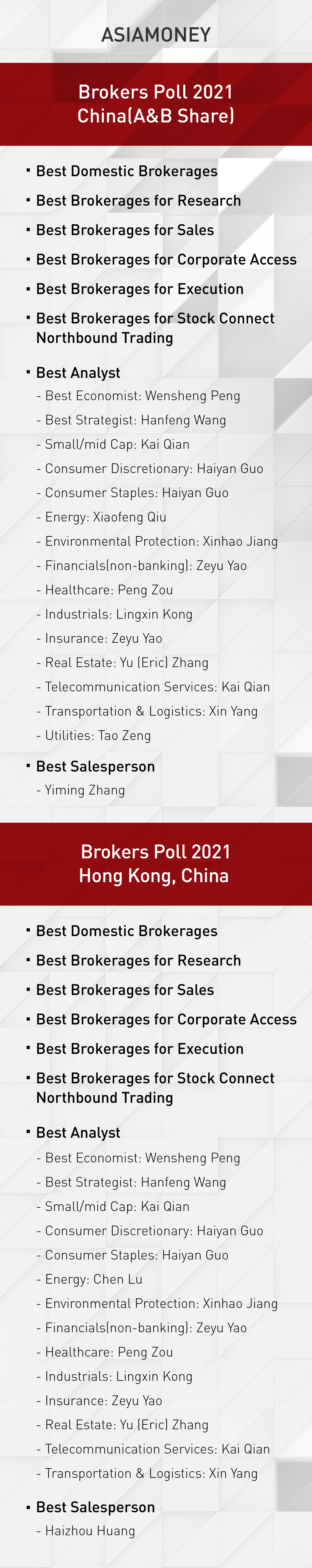 CICC has topped Best Domestic Brokerages for 18 straight years (2004-2021) and captured Best Brokerages for Research and Best Brokerages for Sales for 16 straight years (2006-2021) in Asiamoney Brokers Polls.